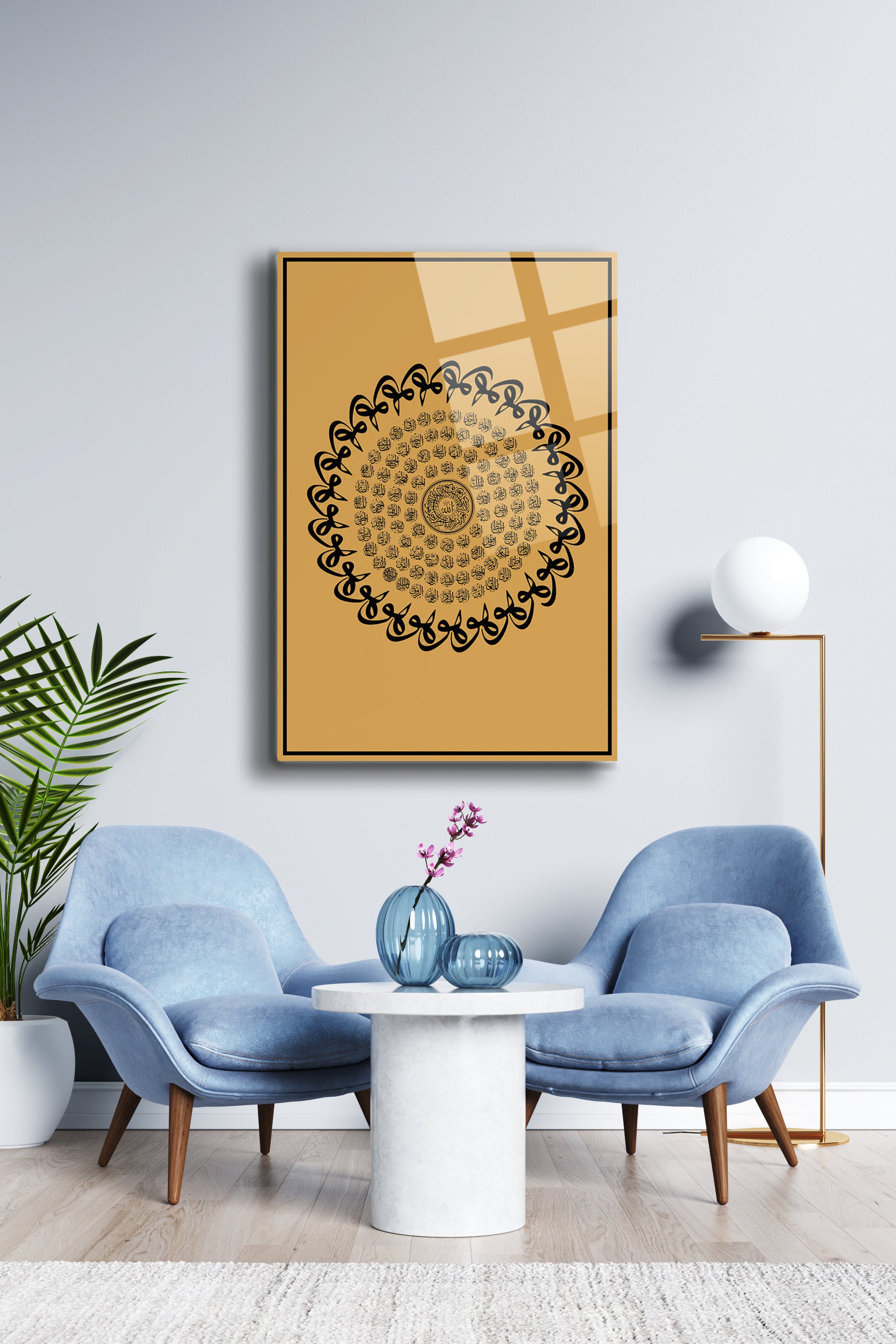 Cam yüzeyin yansıtıcı dokusu ve kusursuz baskı kalitesi, ortama sade ama etkileyici bir ışıltı verir. Her detay, İslam sanatının inceliğini ve zarafetini yansıtır.