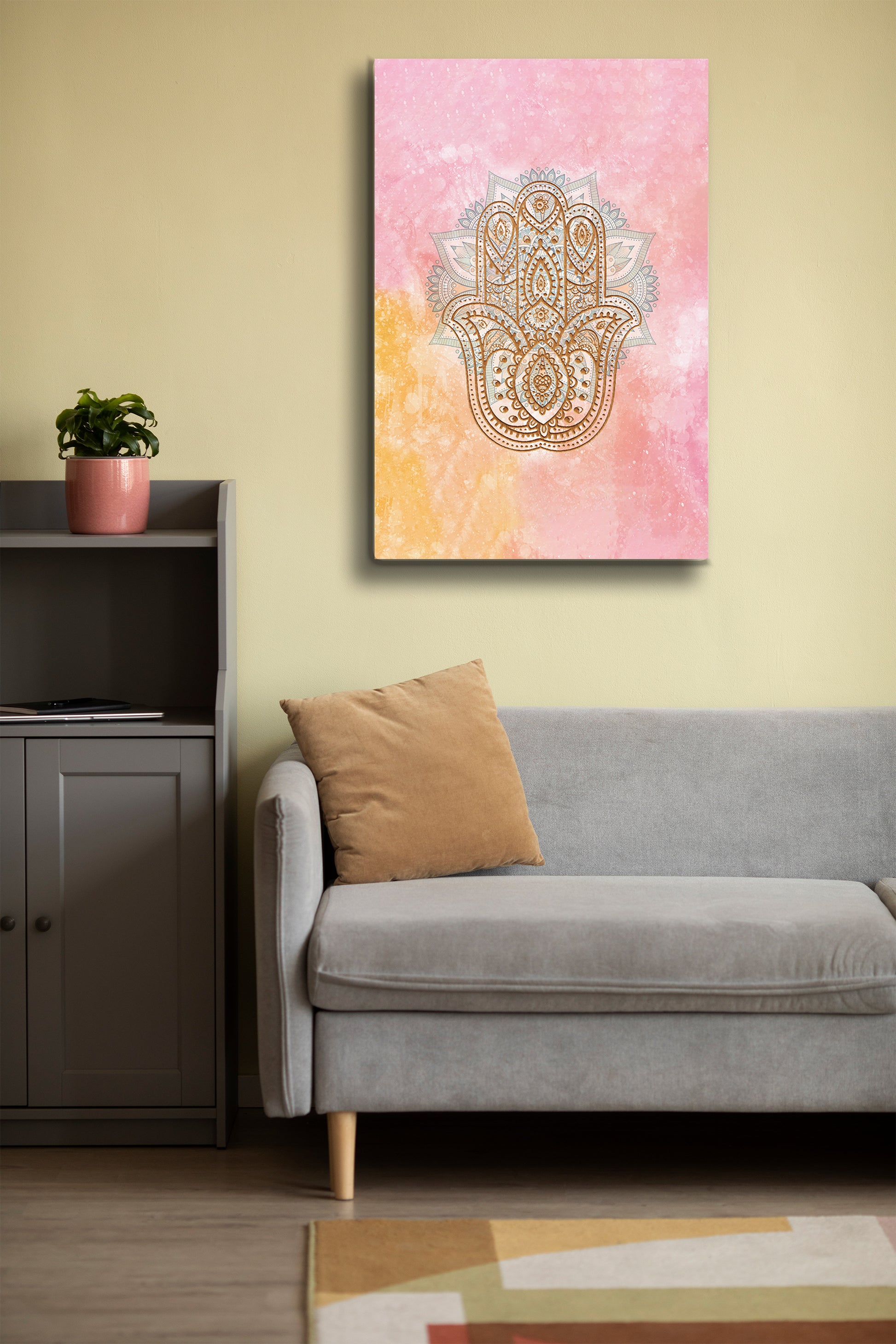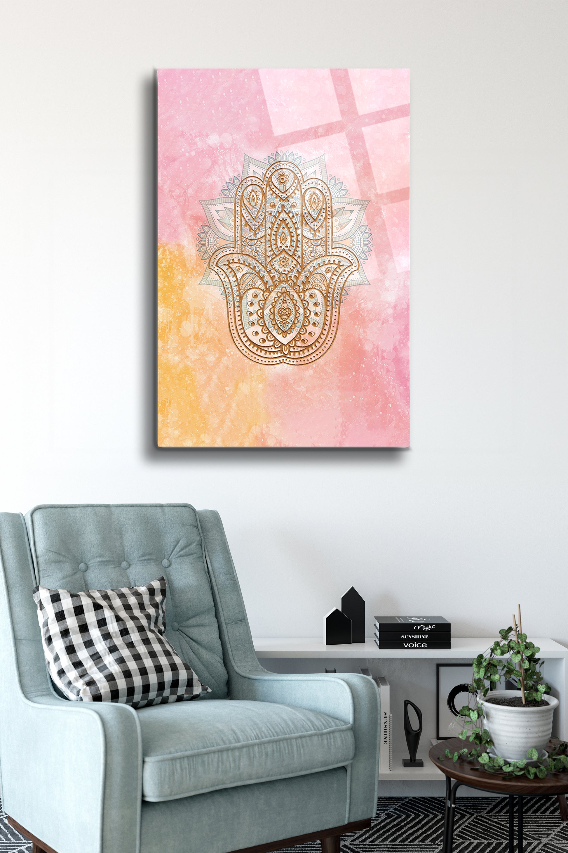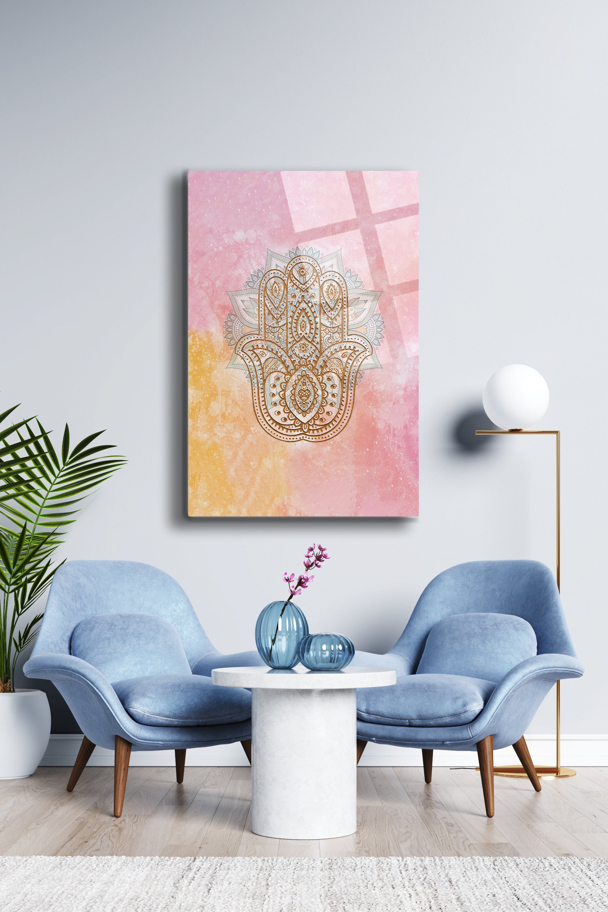 Bu özel tasarım Hamsa Eli Cam Tablo, geleneksel Fatma’nın Eli sembolünü modern bir yorumla sunar. Pembe, sarı ve altın tonlarının huzur veren birleşimi, yaşam alanınıza sıcaklık ve estetik bir denge kazandırır.
