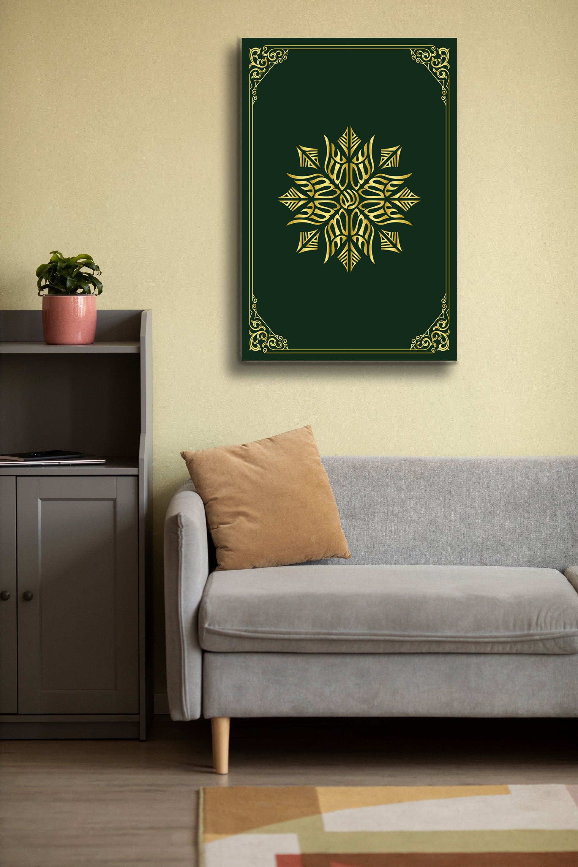 Bu özel İslami Desenli Cam Tablo, yeşil zemin üzerine işlenmiş altın yaldızlı geometrik motifleriyle göz alıcı bir dekoratif etki yaratır.